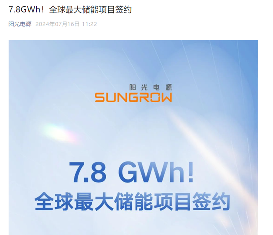 7月16日午间,阳光电源在其官微发文透露,该公司与沙特ALGIHAZ签约全球最大储能项目,容量达7.8GWH。该项目将于2024年开始交付,2025年全容量并网运行。