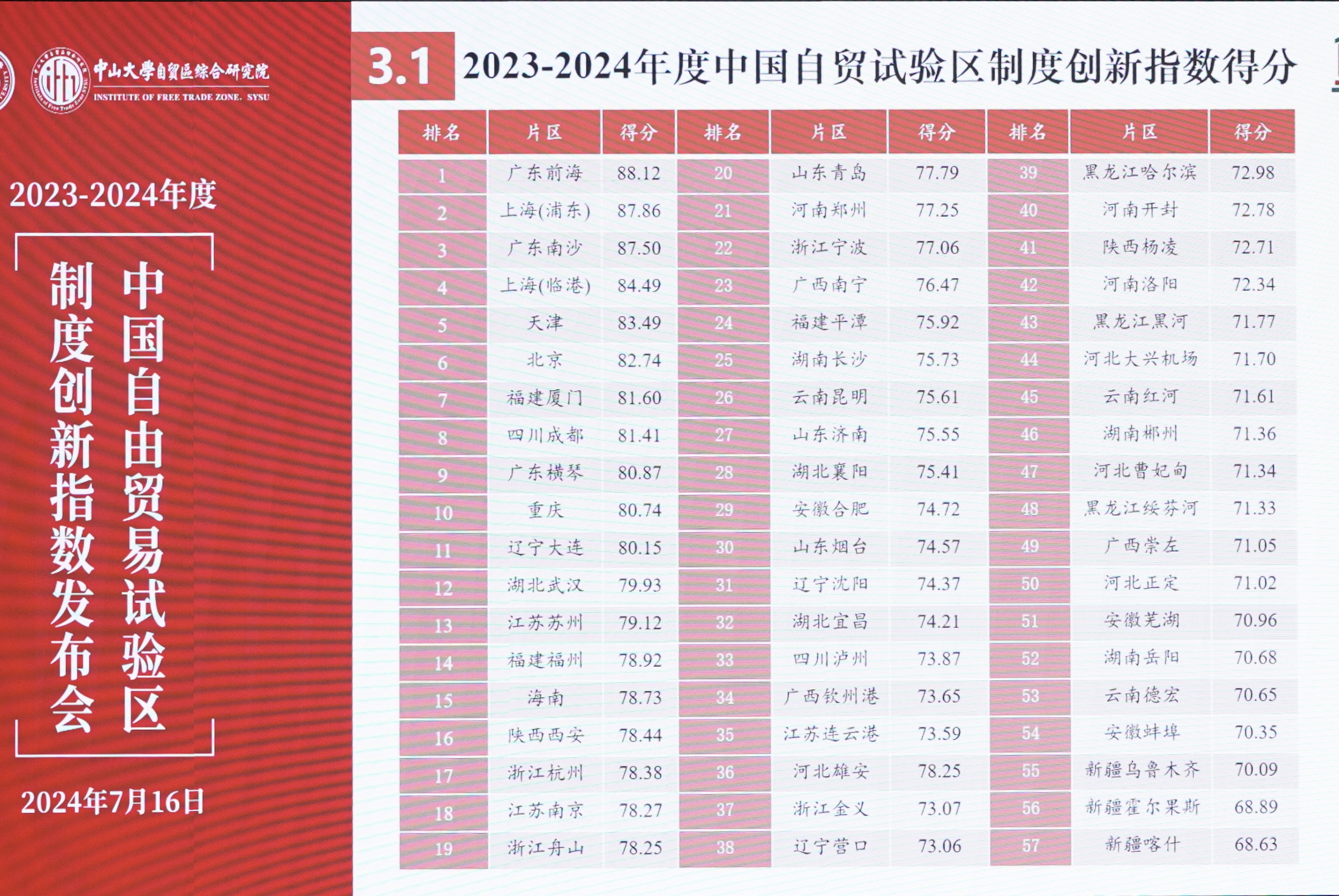 根据“2023—2024年度中国自贸试验区制度创新指数”,广东前海、上海(浦东)、广东南沙、上海(临港)、天津、北京、福建厦门、四川成都、广东横琴、重庆进入全国综合排名前十。